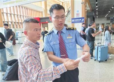 莫衍聪正在为旅客提供服务。赵庆山 摄